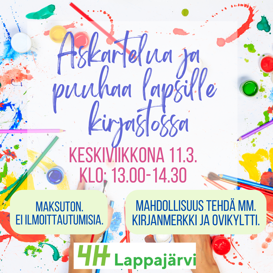 Taidekurssi 6-12 vuotiaille Lappajärven nuorisotiloilla (osoitteessa Nissintie 46) lauantaina 21.3 klo: 11.00-14.00. Mukaan mahtuu 10 osallistujaa. Ilmoittautuminen sulkeutuu automaattisesti, kun kurssi on täynnä. Ilmoittautumisesta lähetetään vahvistusviesti antamaasi sähköpostiosoitteeseen.