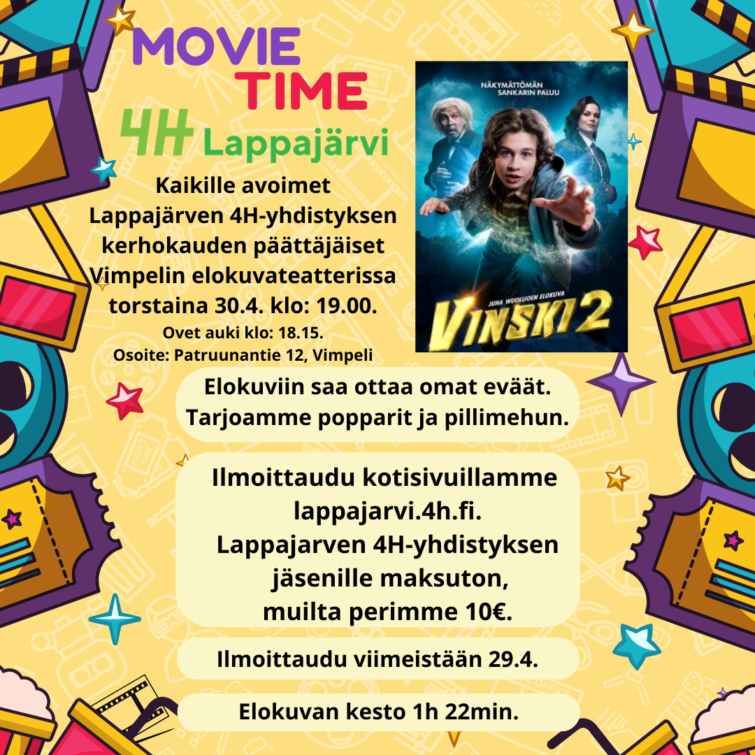 Kerhokauden päättäjäiset on Lappajärven 4H-yhdistyksen jäsenille maksuton ja muilta perimme 10€. Maksu käteisellä ja mielellään tasarahalla elokuviin saapuessa.